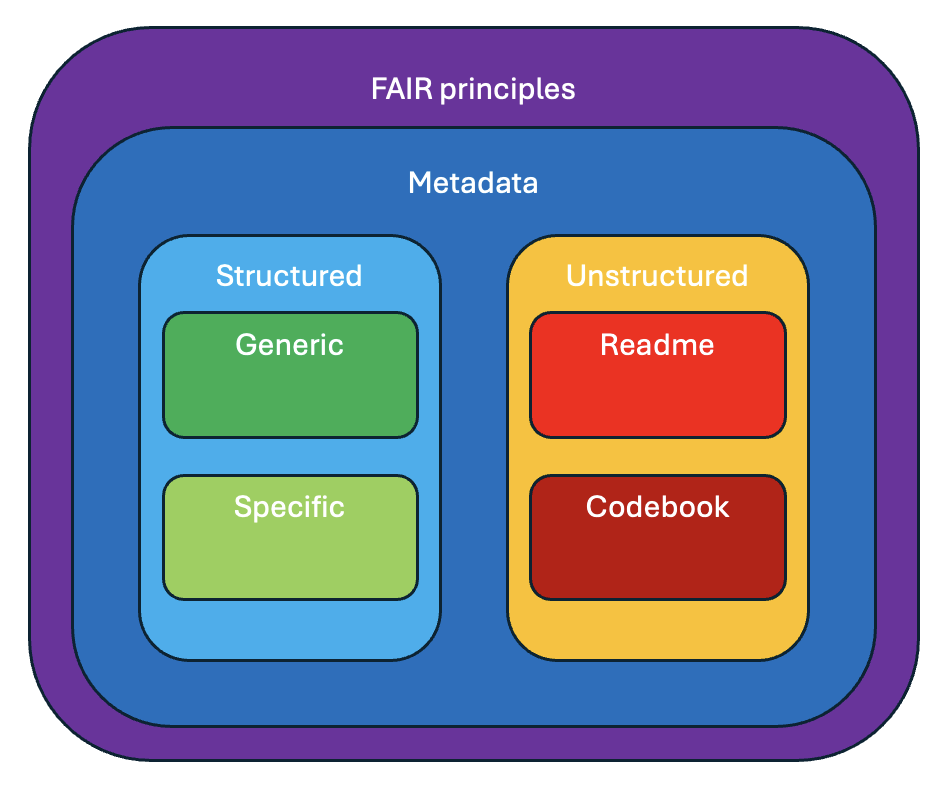 A layered diagram with the FAIR principles as the outermost layer, followed by an inner layer for Metadata. Within Metadata there are two separate cores, one for unstructured and one for structured metadata. Unstructured metadata contains README and codebook; Structured metadata contains Generic and Specific.