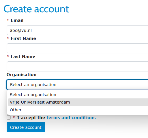 Instead of using SSO to log in, you can also create an account yourself. This is possible both with a VU email address and other email addresses.